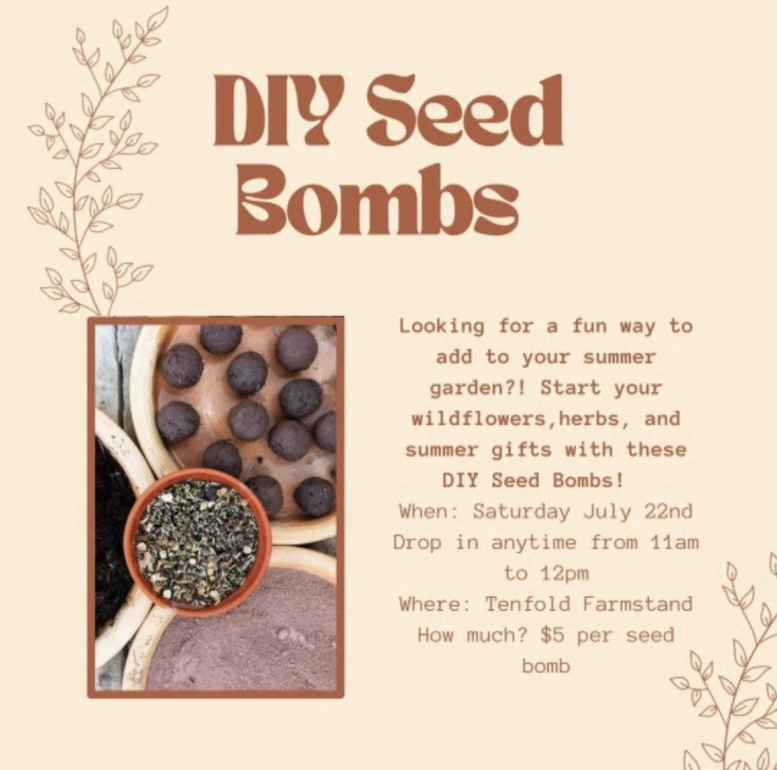 Join Farmer Faith in making all natural seed bombs for your garden. A fun activity for all ages. Drop into Tenfold Farmstand anytime between 11:00 and 12:00 on Saturday, July 22nd. $5 per seed bomb; all materials provided (however, feel free to bring your own seeds if you want to sow a specific plant).